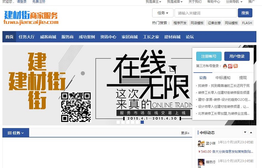 针对实体商户中很多学历以及技能有限的用户,建材街还开放了一个辅助性的服务平台。商家可以把自己的需求挂在平台上标价出售,这时就可以引入另外一群人——有技术专长的人来发挥自己的优势为实体商家进行服务。但是这样一个辅助性平台也还在继续改版中。