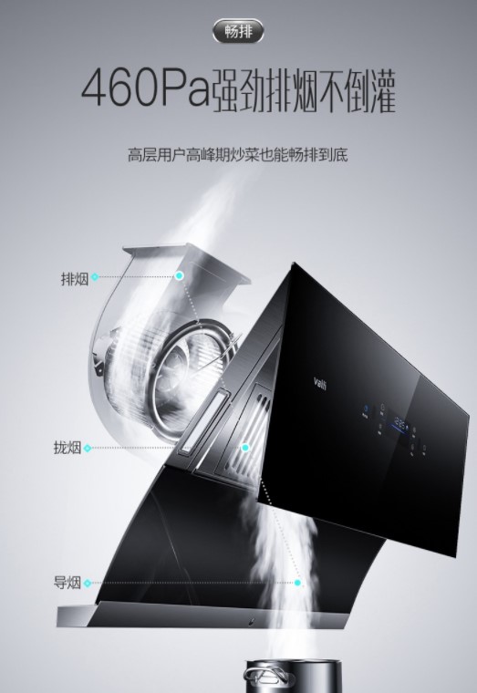 华帝天镜MAX油烟机的最大静压提升到460Pa,比较普通油烟机的风压性能提升了40%以上,大风量配搭大风压,可以说是相得益彰,吸得快也排得尽。大风压设计不但能充分满足爆炒家庭的超大油烟排放,而且面对一些常见的油烟倒灌、厨房异味现象,这款油烟机也不惧怕。