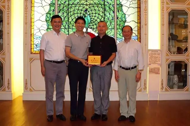 最后,袁斌、姜亚新两位常务副会长为东华环球石文化产业园颁发了会员铜牌,并与东华环球石文化产业园董事长尹安泰、东华环球石文化产业园顾问瞿伟谷合影留念。